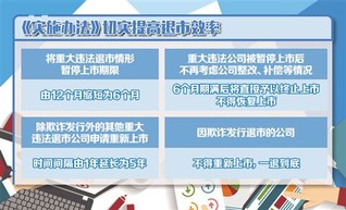 深交所新闻发言人表示,《实施办法》将切实提高退市效率。第一,将重大违法退市情形暂停上市期限,由12个月缩短为6个月;第二,重大违法公司被暂停上市后,不再考虑公司整改、补偿等情况,6个月期满后将直接予以终止上市,不得恢复上市;第三,除欺诈发行外的其他重大违法退市公司申请重新上市,时间间隔由1年延长为5年;第四,因欺诈发行退市的公司不得重新上市,一退到底。