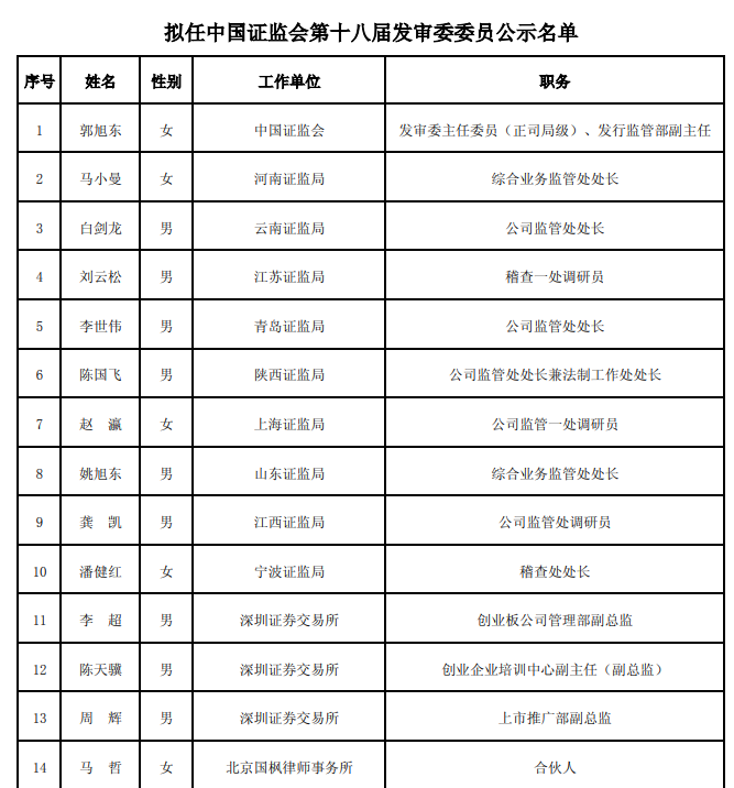 上证报讯 据证监会1月18日消息,根据《中国证券监督管理委员会发行审核委员会办法》,按照第十八届发审委委员遴选方案,经筛选、面试、考察,证监会发审委遴选委员会研究确定了本届发审委委员拟任人选,现予以公示。