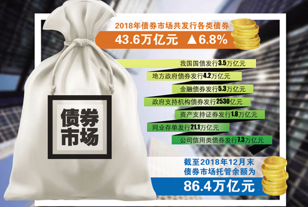 2018年,国债发行3.5万亿元,地方政府债券发行4.2万亿元,金融债券发行5.3万亿元,政府支持机构债券发行2530亿元,资产支持证券发行1.8万亿元,同业存单发行21.1万亿元,公司信用类债券发行7.3万亿元。