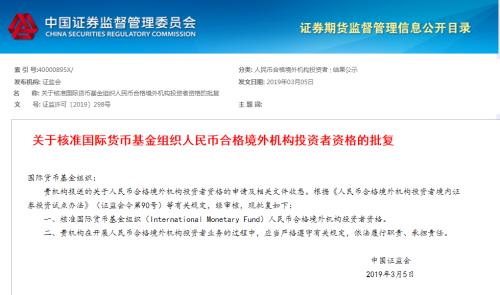 证监会发布《关于核准国际货币基金组织人民币合格境外机构投资者资格的批复(证监会)》。