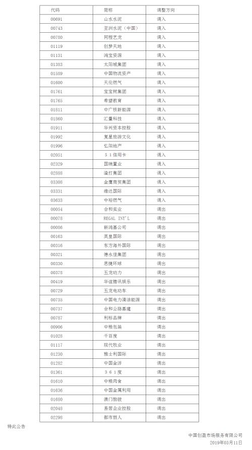 上证报讯 据深交所3月11日公告,因恒生综合大型股指数、中型股指数、小型股指数实施成份股定期调整,根据《深圳证券交易所深港通业务实施办法》的有关规定,港股通股票名单发生调整并自今日起生效,相关调整信息如下: