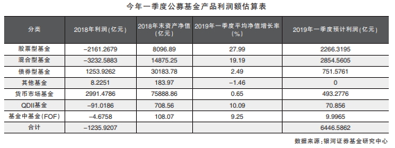 随着今年以来股市全面回暖,股票型基金与混合型基金的净值也同步增长。银河证券基金研究中心统计数据显示,一季度股票型基金净值平均上涨27.99%,混合型基金净值平均上涨19.19%。其中,混合偏股型基金净值平均上涨26.56%,债券型基金净值平均上涨2.49%,货币基金净值平均上涨0.65%。从全部基金估算看,一季度公募基金产品利润额将达到6446.59亿元。其中,股票型基金与混合型基金的利润额将达到5121亿元,不但覆盖了去年一整年的亏损,也相当于2017年的全年利润。