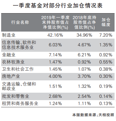 据天相数据统计,行业配置上,制造业的配置比例从2018年年底的34.96%大幅增加至今年一季度末的41.16%,加仓幅度为7.2%;信息传输、软件和信息技术服务业的配置比例也由去年年底的4.67%提升至一季度末的6.03%。另一方面,文化、体育和娱乐业、采矿、建筑等行业均遭到公募基金的小幅减仓。