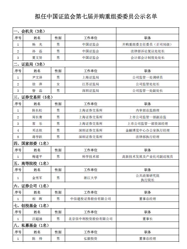 5月5日,证监会公示并购重组委委员拟任人选。根据《中国证券监督管理委员会上市公司并购重组审核委员会工作规程》(证监会公告〔2018〕24号),经筛选、面试、考察,证监会并购重组委遴选委员会研究确定了第七届并购重组委委员拟任人选,现予以公示。
