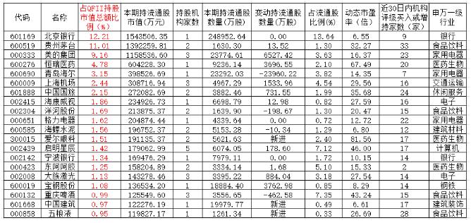 具体来看,截至今年一季度末,北京银行、贵州茅台两只个股QFII持股市值占QFII持股市值总额比例均达到10%以上,分别为12.21%、11.01%,美的集团、恒瑞医药、青岛海尔、上海机场和中国国旅等5只个股QFII持股市值占QFII持股市值总额比例均逾2%。另外,海康威视、洋河股份、格力电器、海螺水泥、爱尔眼科、启明星辰、宁波银行、东阿阿胶、大族激光、宝钢股份、重庆啤酒、中国建筑、五粮液等13只个股QFII持股市值占QFII持股市值总额比例也位居前列,均达到0.95%以上。