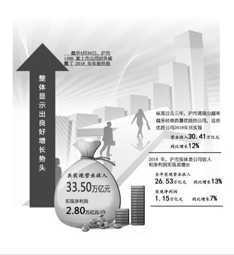 伴随上市公司年报披露的收官,作为经济建设主力军的沪市公司,呈现出靓丽的经营成果。截至4月30日,沪市1466家上市公司对外披露了2018年年报信息,共实现营业收入33.50万亿元,实现净利润2.80万亿元,整体显示出良好增长势头。