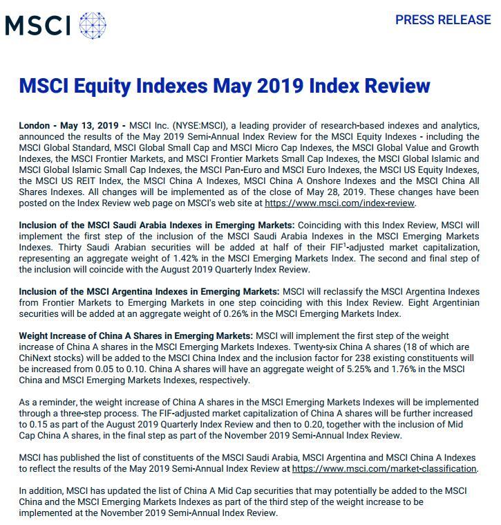 ·此外,MSCI中国全股票小盘股指数将新增522只个股并剔除46只,大部分新增个股来自符合条件的中国创业板指数。
