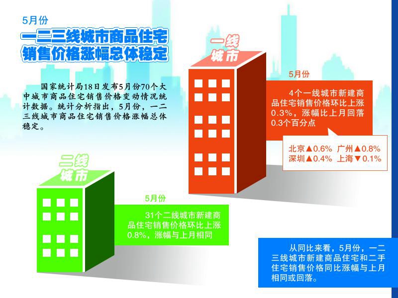 据国家统计局城市司高级统计师刘建伟解读,5月一二三线城市商品住宅销售价格涨幅总体稳定。从环比看,一二线城市新建商品住宅和二手住宅销售价格涨幅均与上月相同或回落;三线城市新建商品住宅涨幅略升,二手住宅涨幅与上月相同。从同比看,一二三线城市新建商品住宅和二手住宅销售价格涨幅均与上月相同或回落。