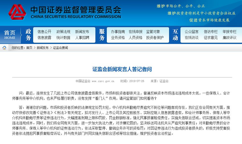 问:最近,连续发生了几起上市公司信息披露虚假案件,市场和投资者都很关注,普遍反映资本市场违法违规成本太低,一些保荐人、会计师事务所等中介机构,也未严格履行职责,没有发挥“看门人”作用,请问监管部门如何看待?