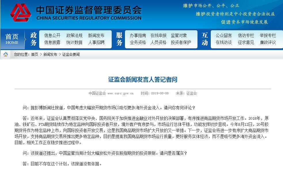 金融界网站8月8日讯 证监会回应中国监管当局计划大幅放松外资在股指期货的投资限制,称目前不存在这个计划,该报道没有依据。