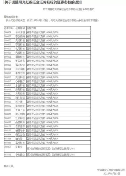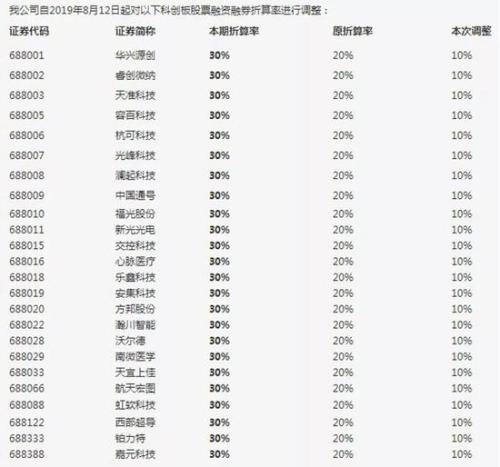 海通证券近日也发布通知,自8月12日起,调整24只科创板股票的融资融券折算率,从20%上调至30%。(注释:提高折算率也会间接提升杠杆,假设有100万元某科创板股票,20%的折算率下,折算为20万元保证金,30%的折算率下,可折算为30万元保证金。)