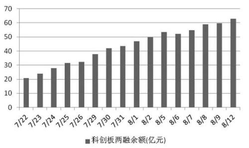 7月22日科创板开市首日,首批25只股票两融余额报20.71亿元;8月12日,在后续仅迎来3只新股的背景下,科创板两融余额已经升至62.93亿元。