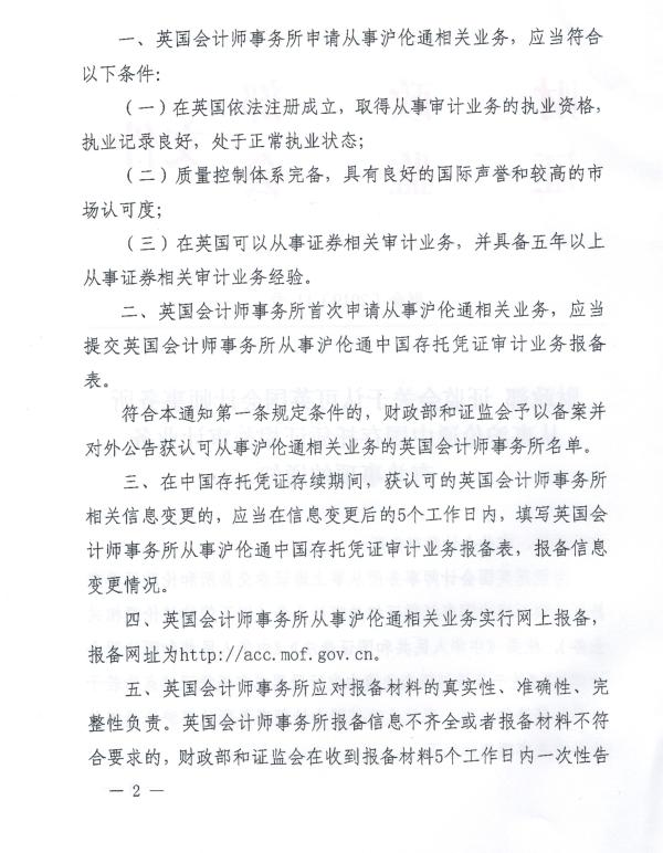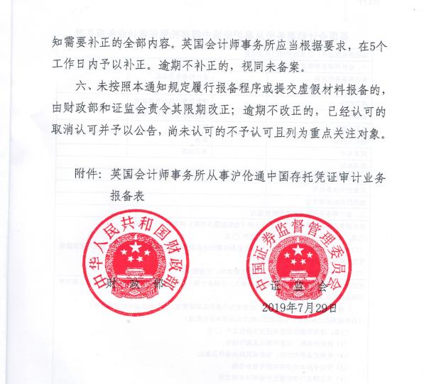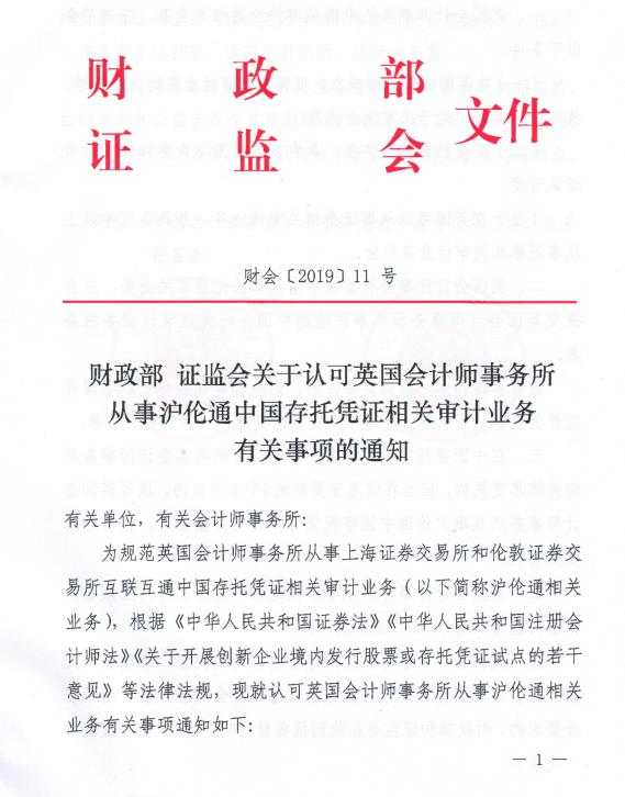 财政部、证监会认可英国会计师事务所从事沪伦通中国存托凭证相关审计业务。