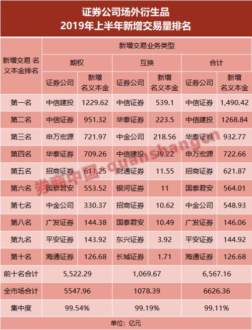 上半年,中信建投证券、中信证券、申万宏源证券、华泰证券、招商证券、国泰君安证券的场外期权新增名义本金规模超过500亿元;其中,中信建投证券也是唯一一家场外期权新增名义本金规模超千亿的券商。