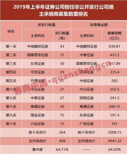 2019年上半年,非公开发行公司债券合计完成发行备案408笔,募集金额4941.32亿元。平均每月完成发行备案68笔,823.55亿元。担任主承销商完成非公债募集量排名前十的证券公司,完成募集规模3208.15亿元,占全市募集规模的64.92%;完成发行264只,占全市场发行数量的64.71%。募集金额排名前十的证券公司,募集规模全部超过100亿元;其中,中信建投证券、中泰证券、国泰君安证券均在400亿元以上,中信建投证券更超过了600 亿元。(王玉玲 费亦多)
