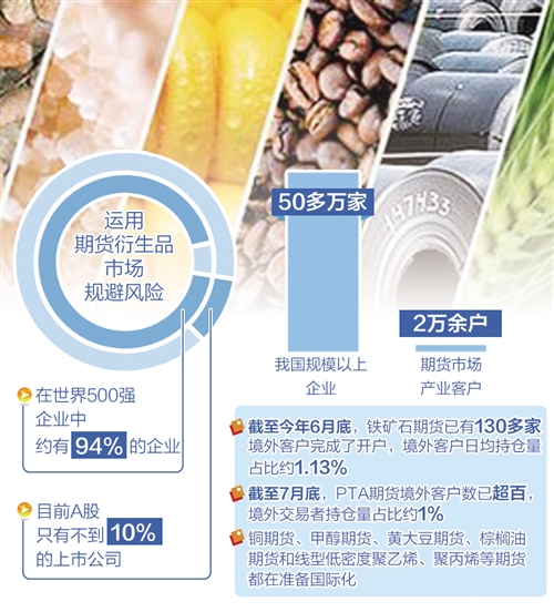 数据表明,在世界500强企业中,约有94%的企业积极运用期货衍生品市场规避风险。但是,目前A股只有不到10%的上市公司运用衍生品工具对冲风险。我国规模以上企业有50多万家,但期货市场产业客户仅有2万余户,大量企业尚未直接参与期货市场。