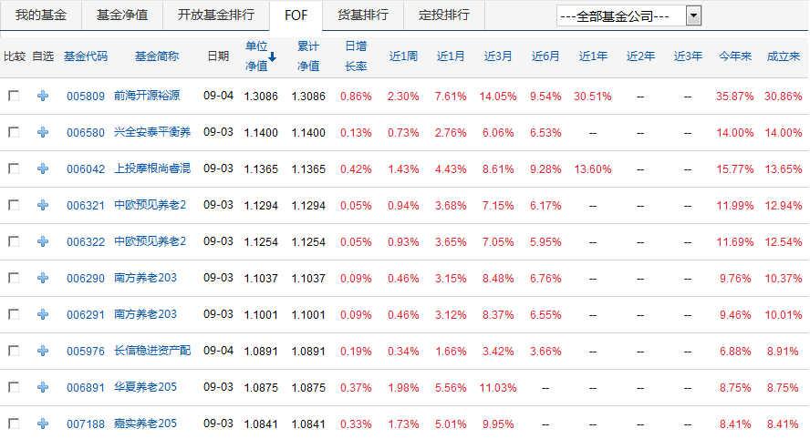 数据显示,前8月14只公募FOF(不同份额合并计算,不含养老FOF)平均收益率为7.78%,表现最好的FOF收获了32.7%的回报。据金融界基金净值排行,截至2019年9月4日,前海开源裕源FOF最新净值为1.3086元,创成立以来新高,也成为公募FOF中首只净值突破1.3元的产品。