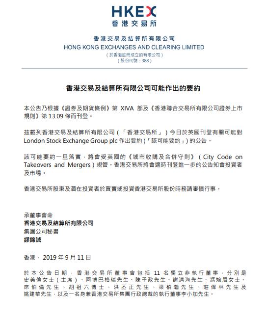 「我们相信,香港交易所与伦敦证券交易所集团的合併是一项互利共赢的重大战略机遇,使亚洲和欧洲两地规模最大和最举足轻重的两个金融中心强强联合,打造一个全球性金融基础设施集团。继与伦敦证券交易所集团进行初步讨论后,我们期待与伦敦证券交易所集团的董事会商讨细节,以体现这宗交易能够符合所有持份者、投资者和两者业务的最佳利益。」