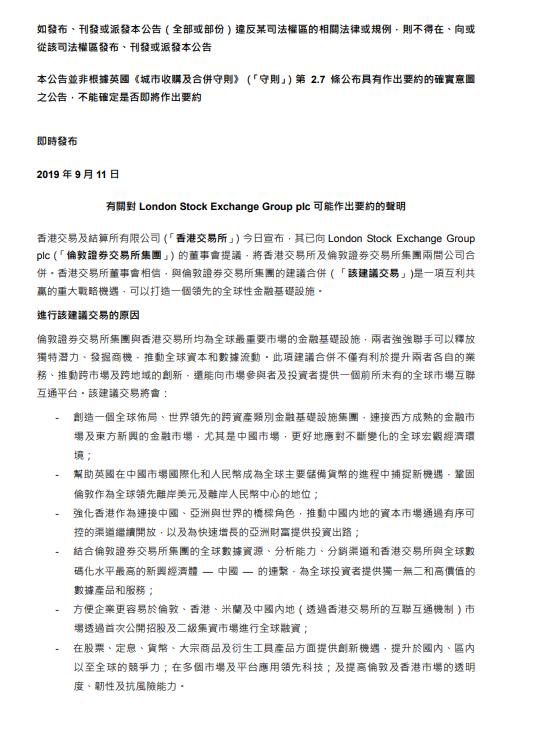 香港交易及结算所有限公司(「香港交易所」)今日宣布,其已向LondonStockExchangeGrouPPlc(「伦敦证券交易所集团」)的董事会提议,将香港交易所及伦敦证券交易所集团两间公司合併。香港交易所董事会相信,与伦敦证券交易所集团的建议合併(「该建议交易」)是一项互利共赢的重大战略机遇,可以打造一个领先的全球性金融基础设施。
