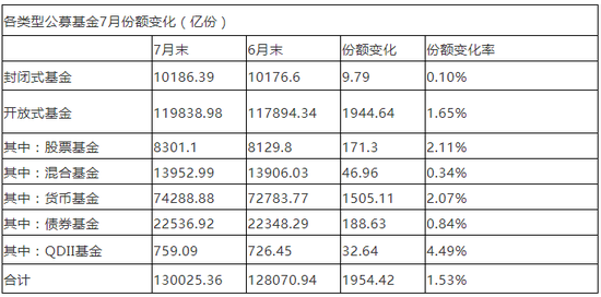 各类型公募基金7月份额变化(亿份)