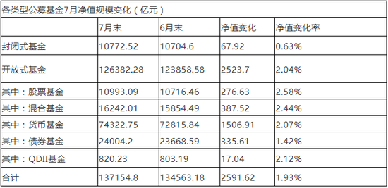 基金业协会数据显示,基民7月踊跃申购基金,同时在国内外资本市场配合下,基金净值也全线增长,7月份各类型基金无论份额还是基金净值全线爆发,