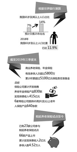 据统计,2019年,保险公司累计开发销售养老年金保险产品830款。目前中国人寿、新华保险、太保寿险、太平人寿、人保寿险以及泰康人寿6家寿险公司可供65周岁(含)以上老年人购买的保险产品达到640余款,产品覆盖了老年人身故、意外伤害、医疗、疾病、护理、养老年金等风险。对于这些产品,市场反映出较强的购买力。截至三季度末,商业养老保险、年金保险有效承保人次超过5800万,商业养老保险保费收入1.38万亿元。