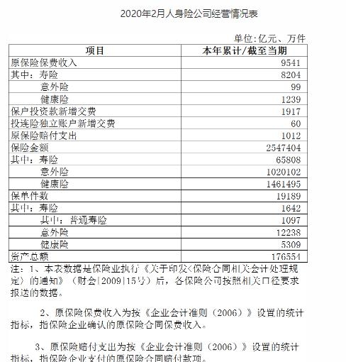 4月2日消息,银保监会近日公布关于2020年2月人身险公司经营情况表。原保险保费累计收入9541亿元,其中,寿险收入8204亿元,意外险收入99亿元,健康险收入1239亿元。保户投资款新增交费1917亿元,投连险独立账户新增交费60亿元。