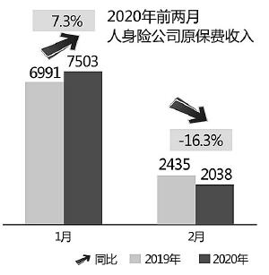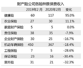 新冠肺炎疫情对保险业的影响,在2月份充分体现:2月份单月保险业实现原保险保费收入2687亿元,同比下降14.4%。其中,财产险收入510亿元,同比下降16.7%;寿险收入1517亿元,同比下降23.7%;人身意外险收入59亿元,同比下降18.1%。不过,健康险在2月份依然保持较快增速,实现保费收入601亿元,同比增长29.2%。