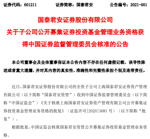 1月3日晚间,国泰君安公告称,该公司全资子公司国君资管近日收到中国证监会核发的《关于核准上海国泰君安证券资产管理有限公司公开募集证券投资基金管理业务资格的批复》。