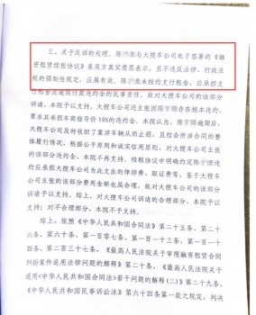 基本案情 : 陈某在签订《融资租赁合同》一年后,与大搜车签署《融资租赁续租协议》。签约后第二个月,陈某开始出现逾期,连续逾期7个月后,陈某拒绝再支付费用,大搜车公司收回车辆。大搜车作为被告反诉原告陈子寒,要求其对大搜车所付债务承担连带清偿责任。法院一审判决支持了大搜车公司反诉要求陈子寒支付剩余租金、逾期付款违约金及大搜车公司因本案支出的合理开支的诉请。