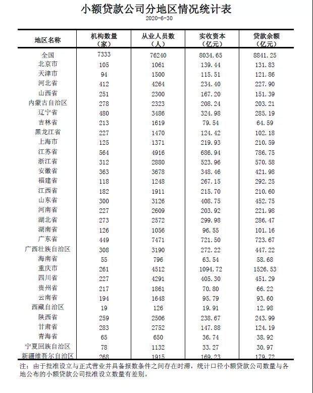 截至2020年6月末,全国共有小额贷款公司7333家。贷款余额8841亿元,上半年减少249亿元。