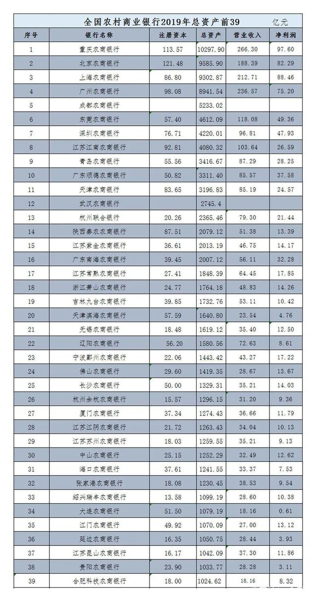 具体来看:资产规模超过1万亿元的1家:重庆农商银行;5000亿~10000亿元4家:北京农商银行、上海农商银行、广州农商银行、成都农商银行;4000亿~5000亿元3家:东莞农商银行、深圳农商银行、江南农商银行;3000亿~4000亿元3家:青岛农商银行、顺德农商银行、天津农商银行。