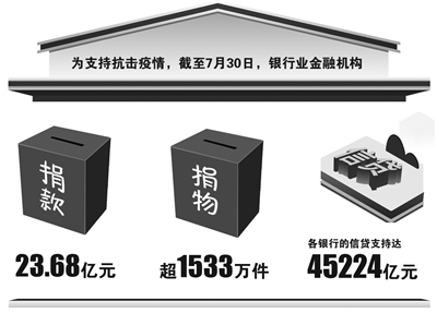 7月31日,由中国银行业协会主办的《2020年度中国银行业发展报告》(以下简称《报告》)发布会在京举行。会议透露,为支持抗击疫情,截至7月30日,根据中国银行业协会官网、会员单位报送及相关慈善机构公布的信息,银行业金融机构捐款23.68亿元,捐物超1533万件;各银行的信贷支持达45224亿元。